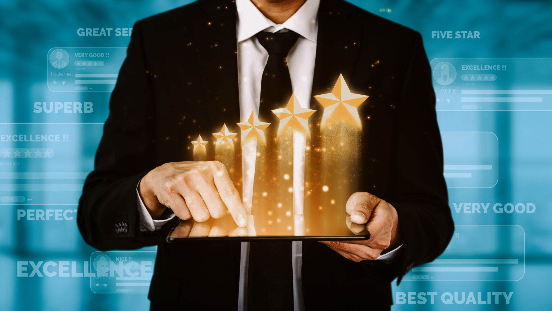Customer review satisfaction feedback survey concept. User give rating to service experience on online application. Customer can evaluate quality of service lead to reputation ranking of business. uds